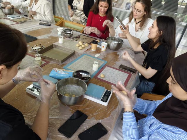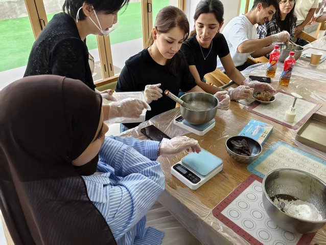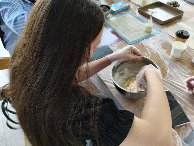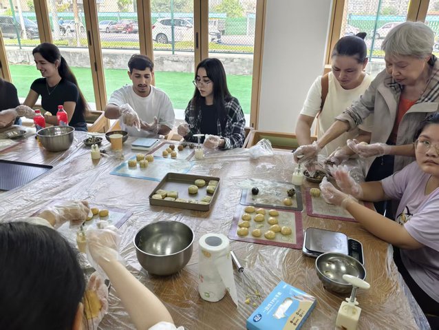 在传统手工艺体验区,“自制月饼”成为最受欢迎的项目。专业糕点师傅现场示范教学,国际学生们拿起面团跃跃欲试。当一个个造型饱满、花纹清晰的月饼从自己手中诞生时,同学们纷纷拿起手机拍照留念,脸上洋溢着满满的成就感。随后,社区工作人员将同学们制作的月饼统一送入烤箱。等待美味出炉的过程中,社区工作人员还分享了各自家乡过中秋的习俗,国际学生们听得津津有味。