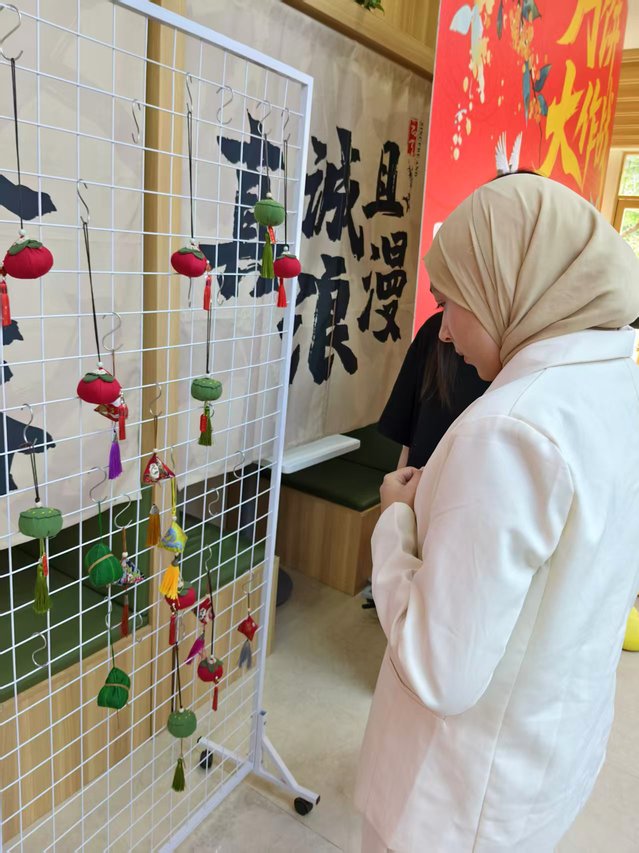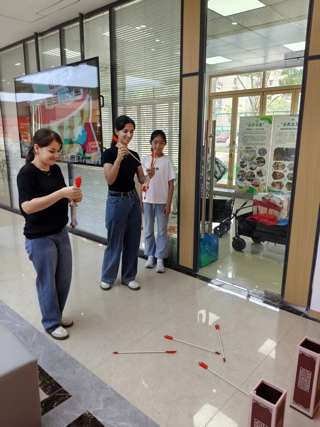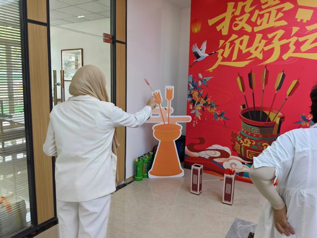 除静态手工艺体验,趣味互动游戏区氛围异常热烈。投壶游戏前,同学们排队听志愿者讲规则,投掷时有人成功引欢呼,有人多次尝试不气馁。夹东西游戏考验手眼协调,部分国际学生第一次用筷子显得慌乱,后来在同学帮助下可以熟练操作。成功完成挑战的学生会获得绣有吉祥图案的香囊,香囊艾草香既是纪念,也饱含祝福。