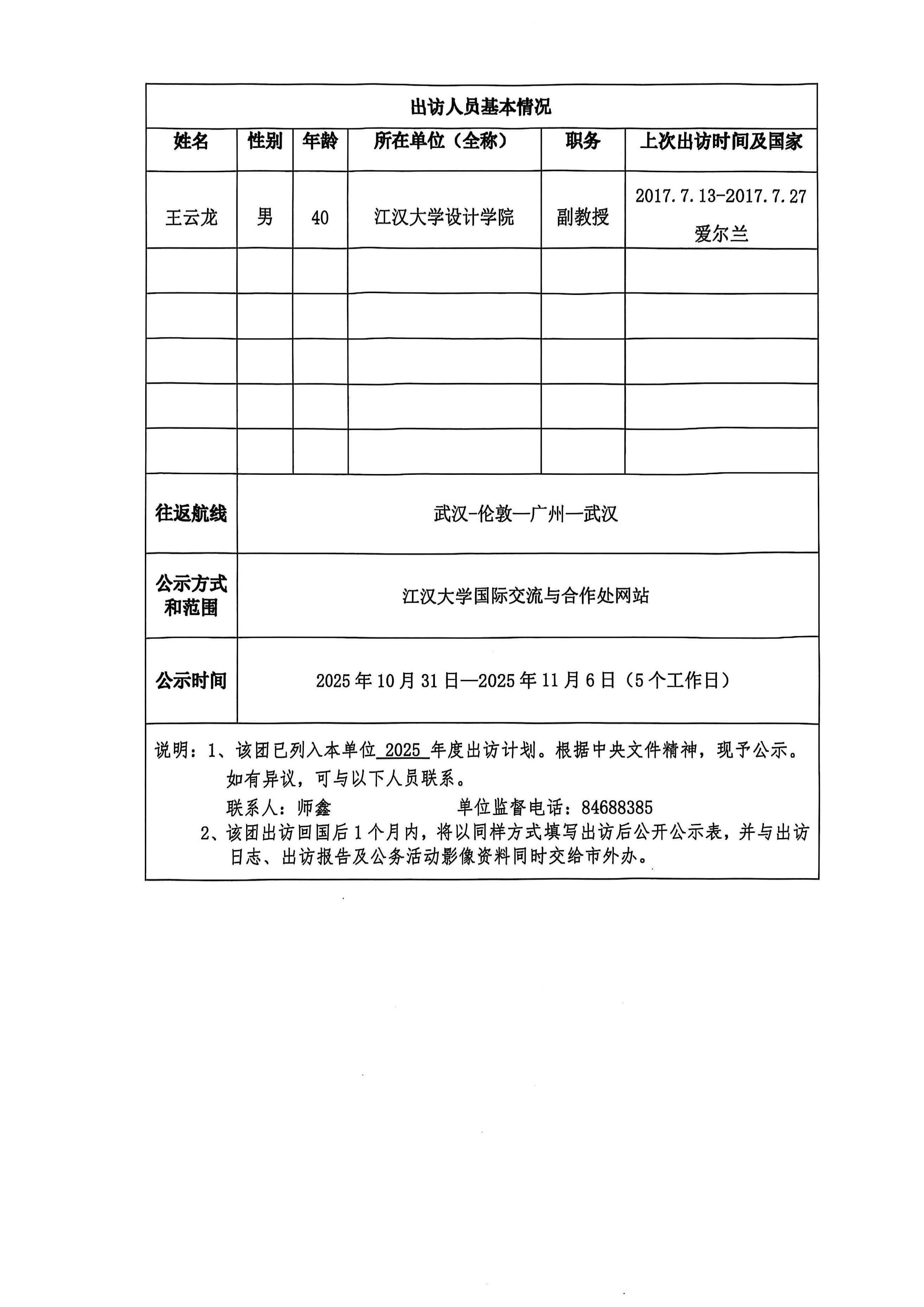 王云龙团组 因公临时出国(境)团组和人员信息公开公示表 (出访前)