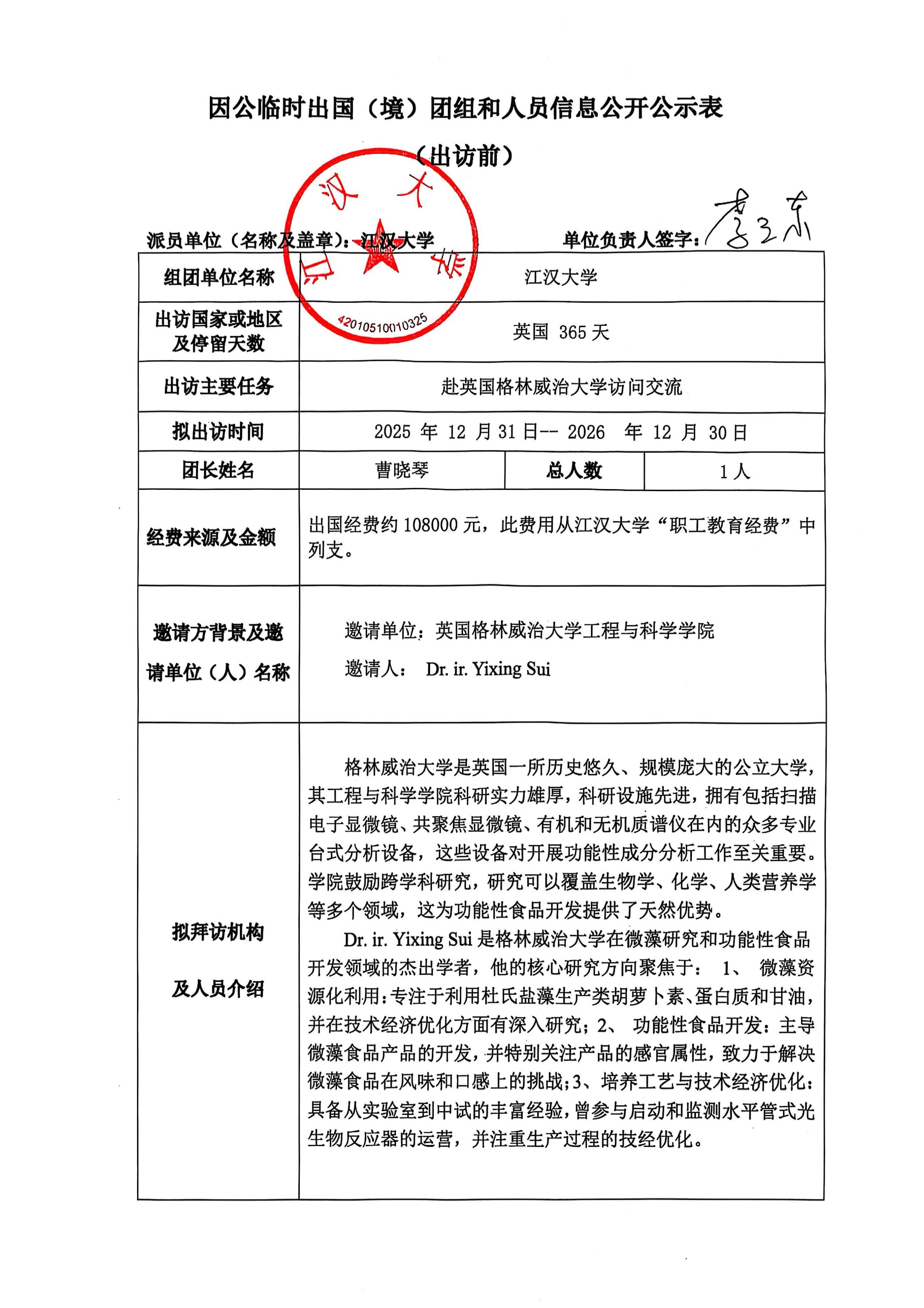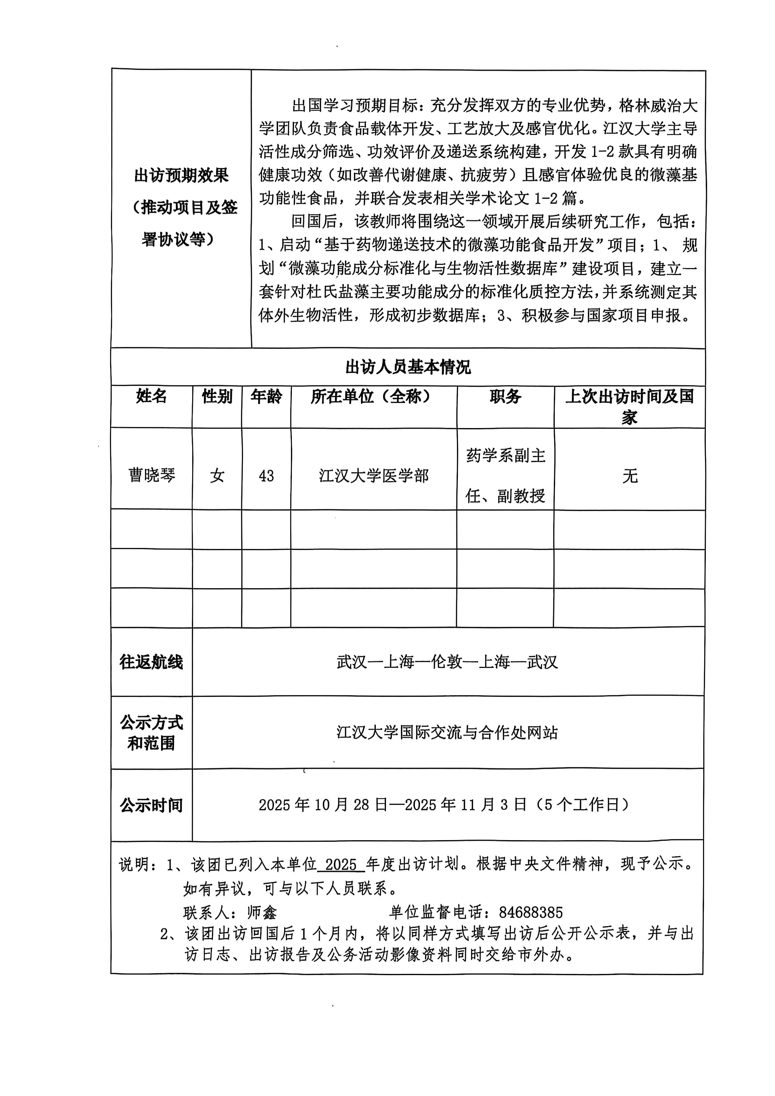 曹晓琴团组 因公临时出国(境)团组和人员信息公开公示表 (出访前)