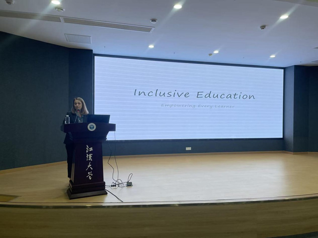 11月20日下午,江汉大学外籍专家/教师学术系列讲座第十一场在图书馆负一楼报告厅成功举办。此次讲座邀请到的是江汉大学美国籍英语教师斯蒂芬妮·奥卡特(Stephanie Orcutt),讲座主题为《论教育的包容性》。本场讲座由国际交流与合作处主办,外教合作教师、外国语学院大学英语系副主任谭银山老师担任主持。