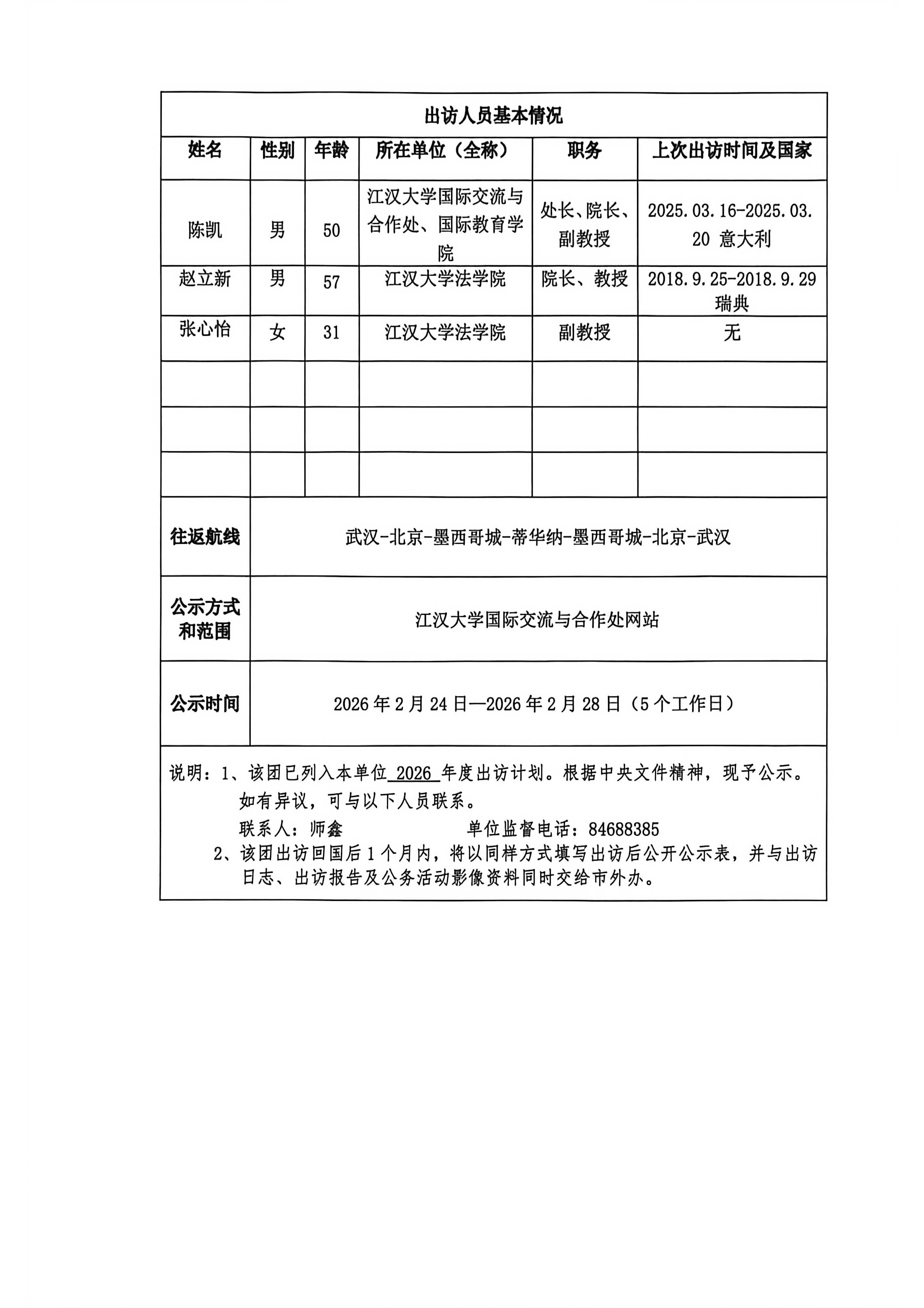 陈凯团组 因公临时出国(境)团组和人员信息公开公示表 (出访前)