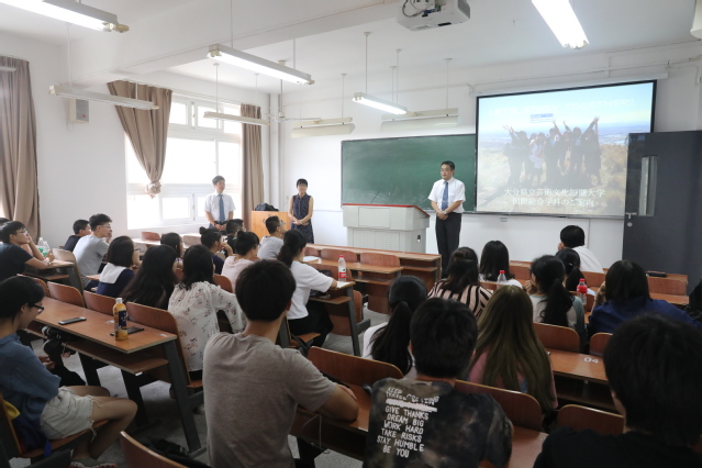 9月7日,日本大分县立艺术文化短期大学国际综合学科畴谷宪洋教授、宫野幸岳副教授来我校访问,为2016级日语专业学生举办了“1.5+1+1.5”留学项目说明会。
